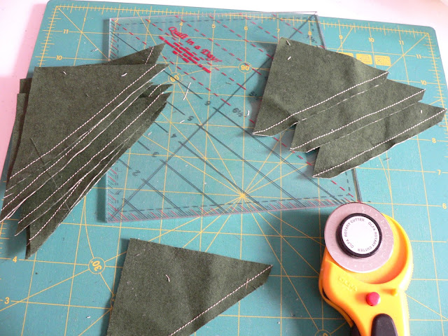 It sure makes quick work of trimming HSTs! I don't throw my trimmed dog ears over my shoulder like Eleanor Burns does (just so you know). I'm thinking mug rugs for FMQ practice with the leftovers from the stocking.