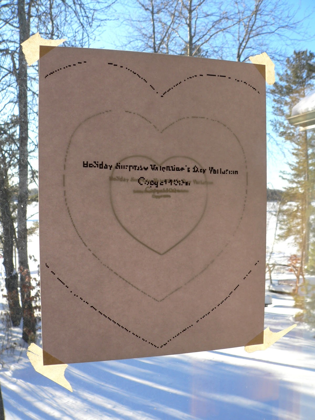 I dug around in the kitchen for a roll of freezer paper, taped it over the top and using the spacing between the other sizes as a guide drew my heart. I'm terrible at free hand drawing... and I wanted my heart sides to be balanced. This method worked great!